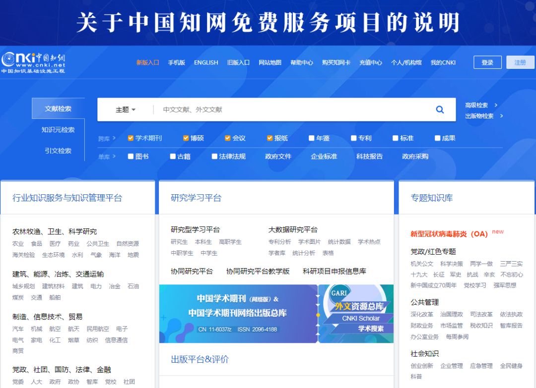 中国知网平台—面向海内外读者提供中国学术文献、外文文献、学位论文、报纸、会议、年鉴、工具书等各类资源统一检索、统一导航、在线阅读和下载服务。